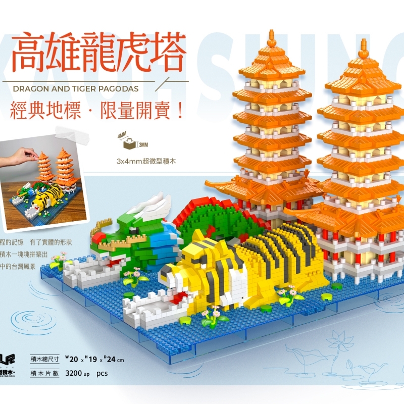 以 3×4 mm 超微型顆粒細緻還原高雄經典地標「龍虎塔」,屋簷層次、龍虎出入口與蓮池意象一應俱全。成品尺寸 W20×D19×H24 cm、約 3200+ 顆,限量發行,收藏與擺設皆出色。